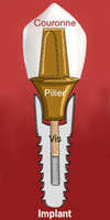 Un implant dentaire est assimilable à une racine artificielle. Il se présente le plus souvent sous la forme d’une vis en titane placée dans l’os de la mâchoire. Il remplace la ou les racines d’une dent absente et sert de support pour réaliser une couronne, un bridge, pour stabiliser une prothèse amovible...